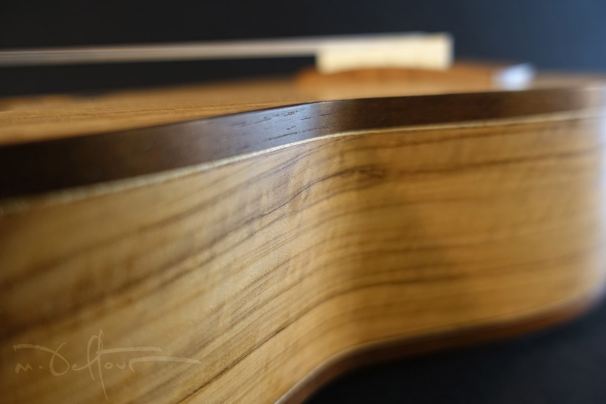 Bindings: Peruvian Walnut bindings with walnut and white purflings. Purflex rosette and end graft